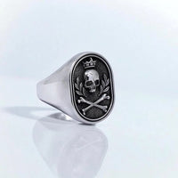 Add a touch of edgy style to your look with this Sterling Silver Crowned Skull and Crossbones Signet Ring. This handmade Gothic-inspired jewelry piece is perfect for men who love bold statement pieces. Embrace your inner biker with this unique ring that exudes coolness and attitude. Stand out from the crowd with this one-of-a-kind accessory that will surely make heads turn. Exclusive design, made in limited quantities. Add to cart now!